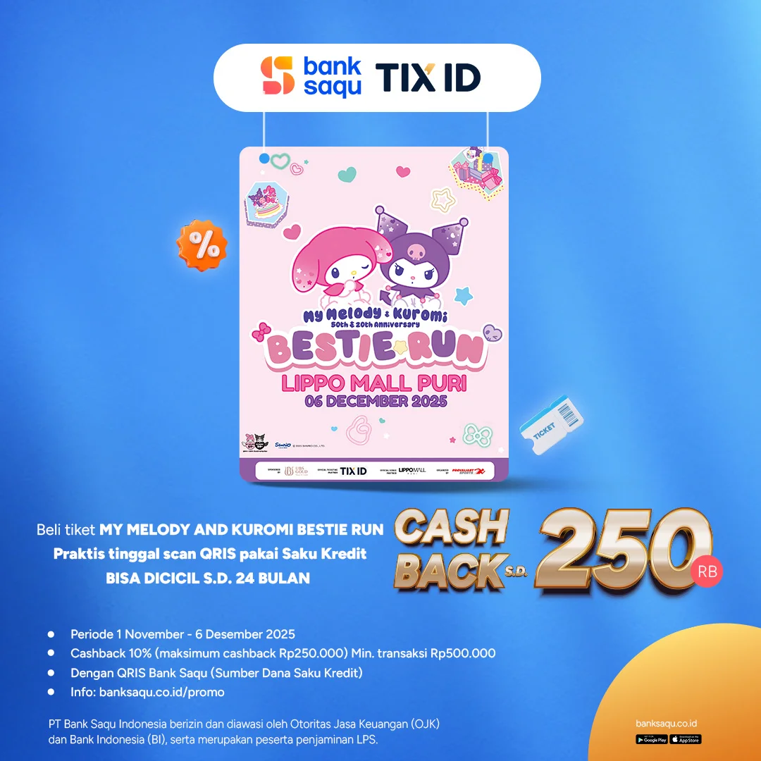 Bestie Run makin seru dengan promo spesial dari Bank Saqu! Kamu bisa beli tiket My Melody & Kuromi Bestie Run cukup scan QRIS pakai Saku Kredit dan nikmati cashback hingga 250RB + pilihan cicilan sampai 24 bulan.