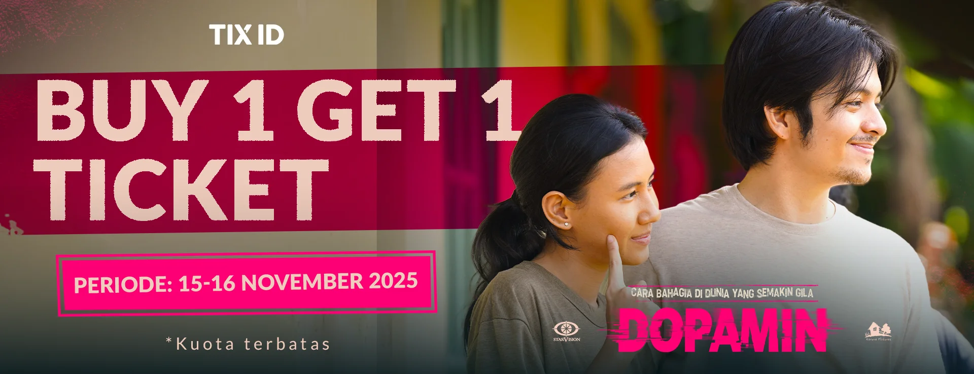 Dapatkan promo Buy 1 Get 1 Free film DOPAMIN mulai tanggal 15 - 16 November 2025. Pesan tiketnya sekarang dengan klik tombol “Beli Tiket” di bawah ini!