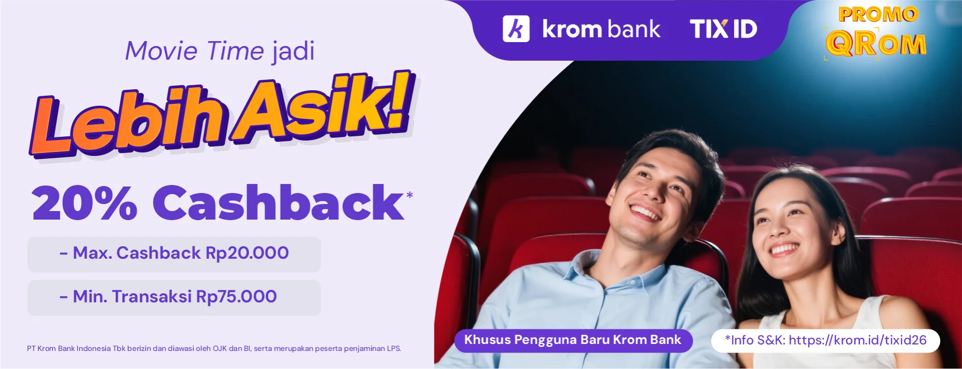 Dapatkan cashback 20% sampai dengan Rp20.000 dengan minimum pembelanjaan Rp75.000 khusus pembayaran menggunakan QRIS Krom Bank