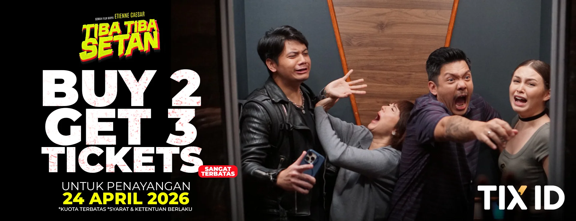 Dapatkan promo Buy 2 Get 3 Tickets film TIBA TIBA SETAN periode 24 April 2026. Pesan tiketnya sekarang dengan klik tombol “Beli Tiket” di bawah.