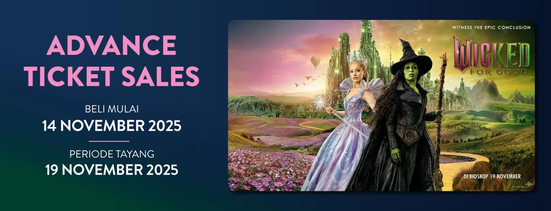 Segera pesan tiket nonton Wicked: For Good di bioskop kesayanganmu karena Advance Ticket Sales telah dimulai untuk penayangan mulai tanggal 14 November 2025! Klik tombol “Beli Tiket” di bawah sekarang juga!