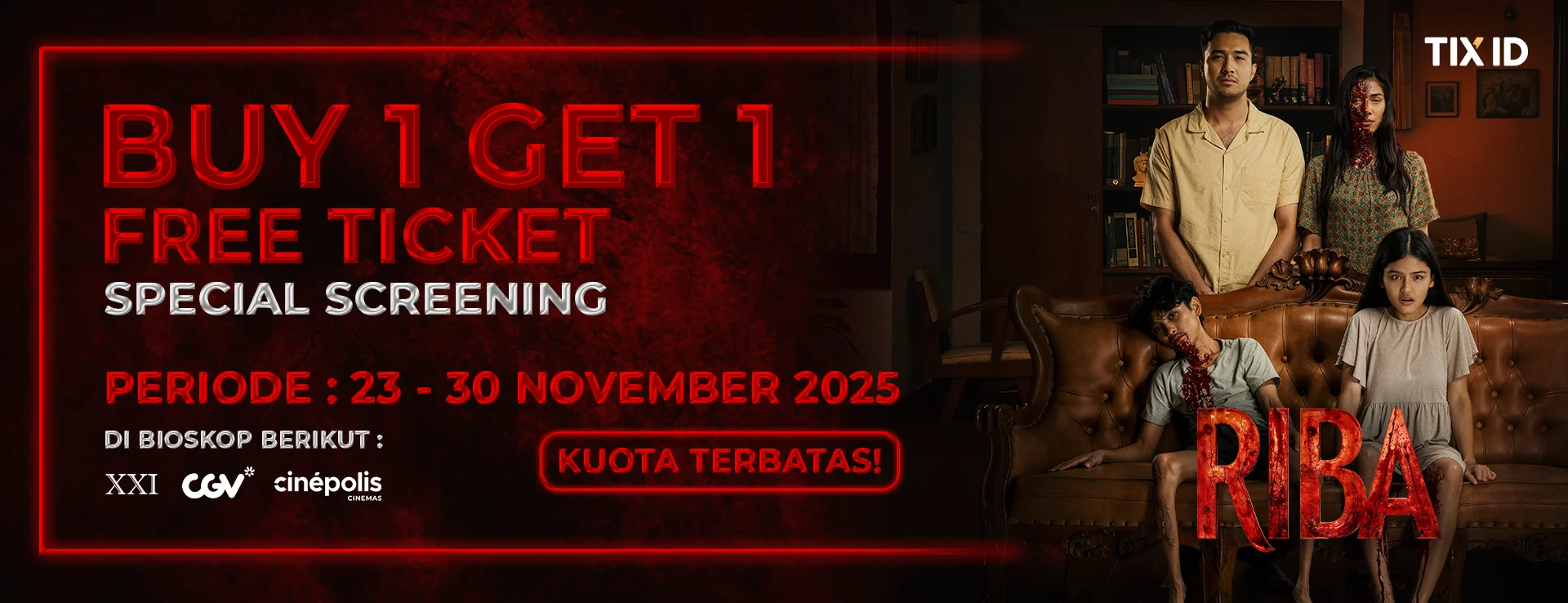 Dapatkan promo Buy 1 Get 1 Free film RIBA mulai tanggal 23 November 2025, khusus untuk Special Screening tanggal 29 - 30 November 2025. Pesan tiketnya sekarang dengan klik tombol “Beli Tiket” di bawah ini!