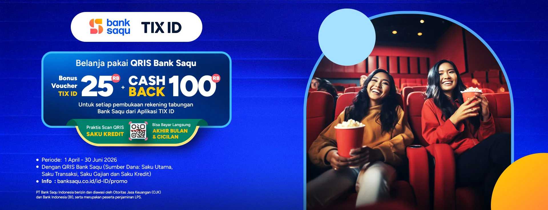 Dapatkan e-Voucher TIX ID dan Cashback Saldo Bank Saqu hingga Rp125.000 berlaku untuk 1.000 pengguna TIX ID pertama yang mendaftar menjadi Nasabah baru Bank Saqu dan melakukan penempatan dana di Bank Saqu selama periode program.