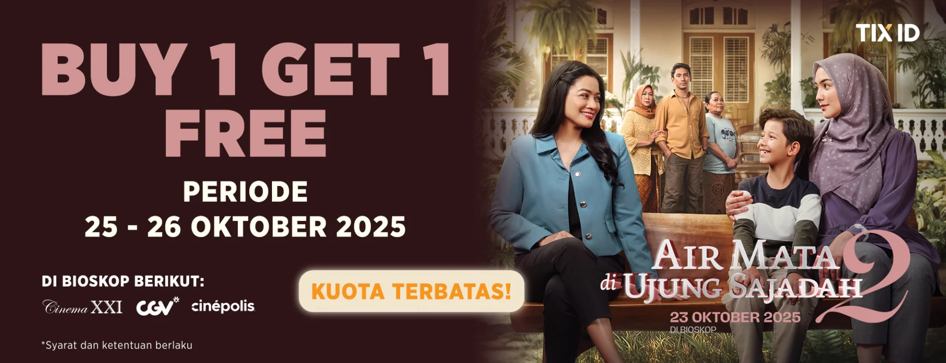 Dapatkan promo Buy 1 Get 1 Free film AIR MATA DI UJUNG SAJADAH 2 mulai tanggal 25 - 26 Oktober 2025. Pesan tiketnya sekarang dengan klik tombol “Beli Tiket” di bawah ini!