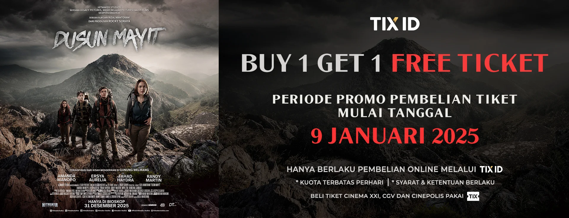 Dapatkan promo Buy 1 Get 1 Free film DUSUN MAYIT mulai tanggal 09 Januari 2026. Pesan tiketnya sekarang dengan klik tombol “Beli Tiket” di bawah ini!
