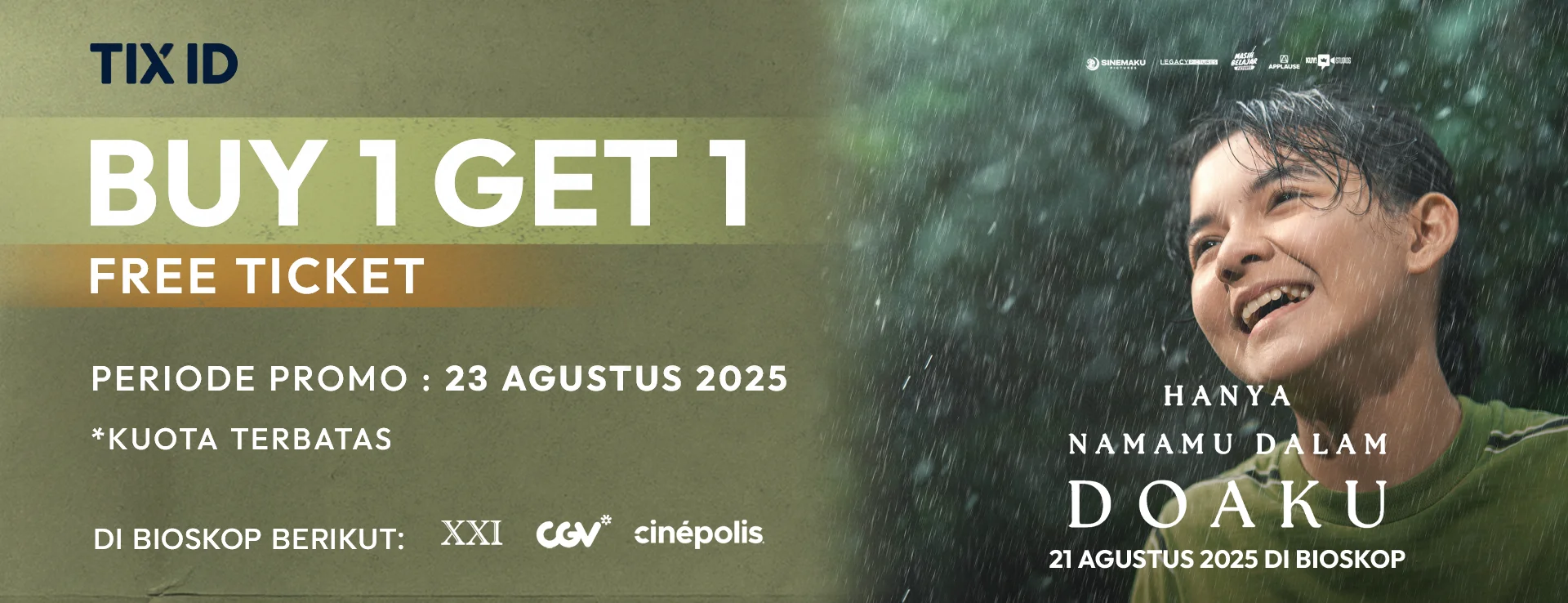 Dapatkan promo Buy 1 Get 1 Free film Hanya Namamu Dalam Doaku mulai tanggal 23 Agustus 2025. Pesan tiketnya sekarang dengan klik tombol “Beli Tiket” di bawah ini!