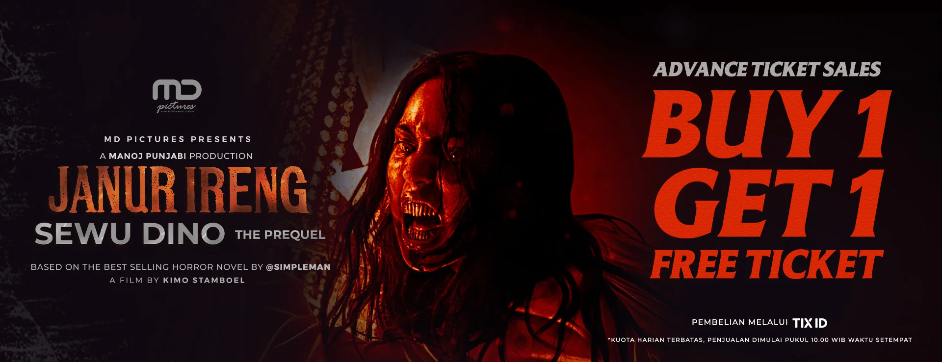 Dapatkan promo Buy 1 Get 1 Free film Janur Ireng: Sewu Dino The Prequel mulai tanggal 19 Desember 2025, untuk penayangan perdana tanggal 24 Desember 2025. Pesan tiketnya sekarang dengan klik tombol “Beli Tiket” di bawah ini!