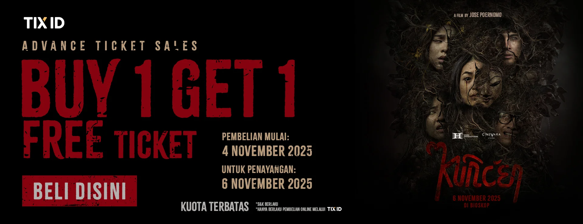 Dapatkan promo Buy 1 Get 1 Free film KUNCEN mulai tanggal 04 November 2025, untuk penayangan perdana tanggal 06 November 2025. Pesan tiketnya sekarang dengan klik tombol “Beli Tiket” di bawah ini!