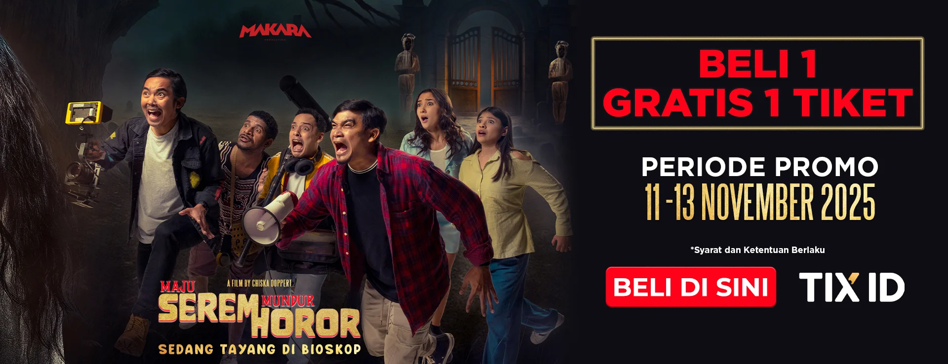 Dapatkan promo Buy 1 Get 1 Free film MAJU SEREM MUNDUR HORROR mulai tanggal 11 - 13 November 2025. Pesan tiketnya sekarang dengan klik tombol “Beli Tiket” di bawah ini!