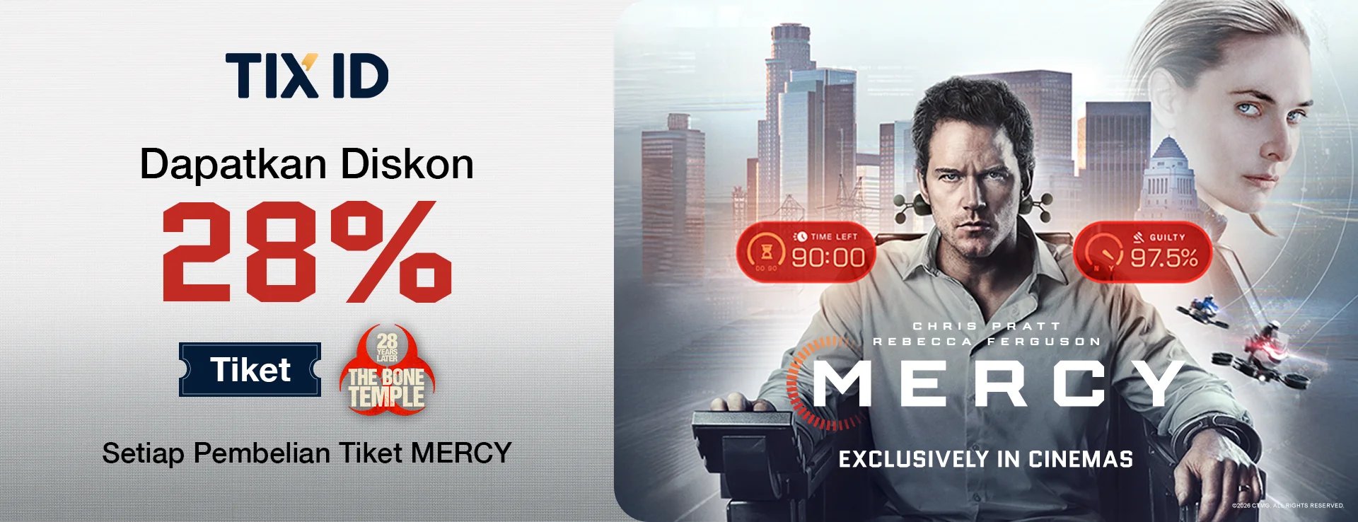 Segera nonton film MERCY sekarang, sehingga kamu bisa mendapatkan Voucher Diskon 28% nonton film 28 Year Later: The Bone Temple di TIX ID!!