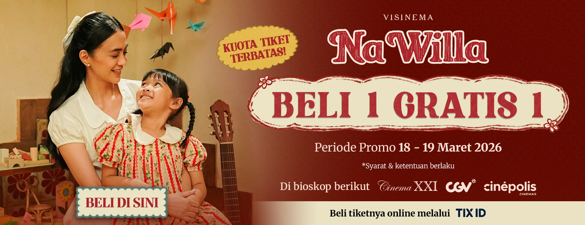 Dapatkan promo Buy 1 Get 1 Free film NA WILLA mulai tanggal 18 Maret 2026. Pesan tiketnya sekarang dengan klik tombol “Beli Tiket” di bawah ini!