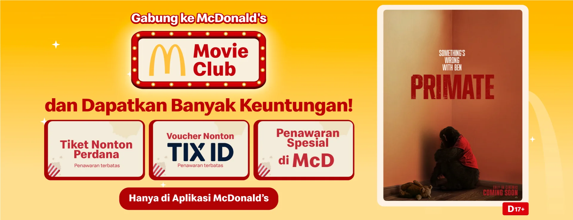 Segera gabung McDonald's Movie Club dan tukar Penawaran Spesial nya! Sehingga kamu bisa mendapatkan voucher nonton film PRIMATE di TIX ID senilai Rp20.000,- .