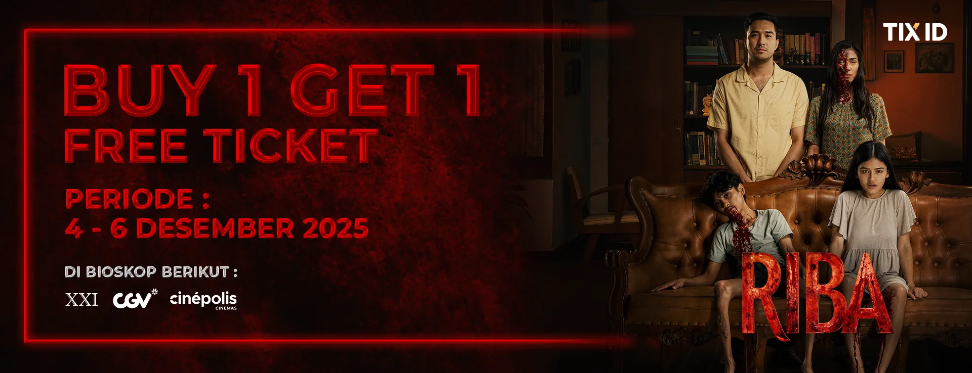 Dapatkan promo Buy 1 Get 1 Free film RIBA mulai tanggal 04 - 06 Desember 2025. Pesan tiketnya sekarang dengan klik tombol “Beli Tiket” di bawah ini!
