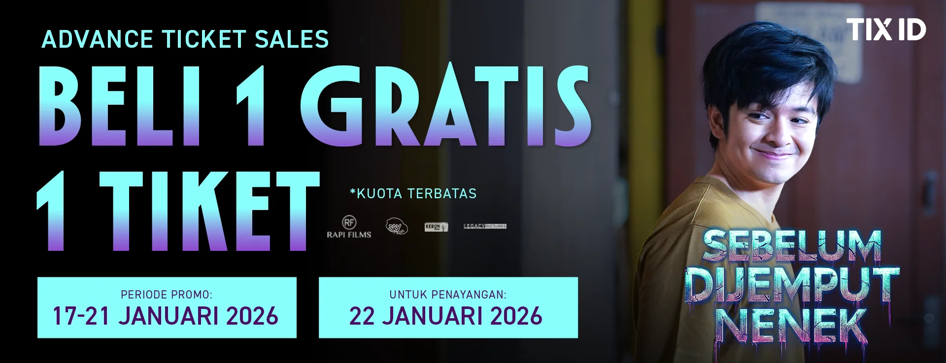 Dapatkan promo Buy 1 Get 1 Free film SEBELUM DIJEMPUT NENEK mulai tanggal 17 Januari 2026, untuk penayangan perdana tanggal 22 Januari 2026. Pesan tiketnya sekarang dengan klik tombol “Beli Tiket” di bawah ini!
