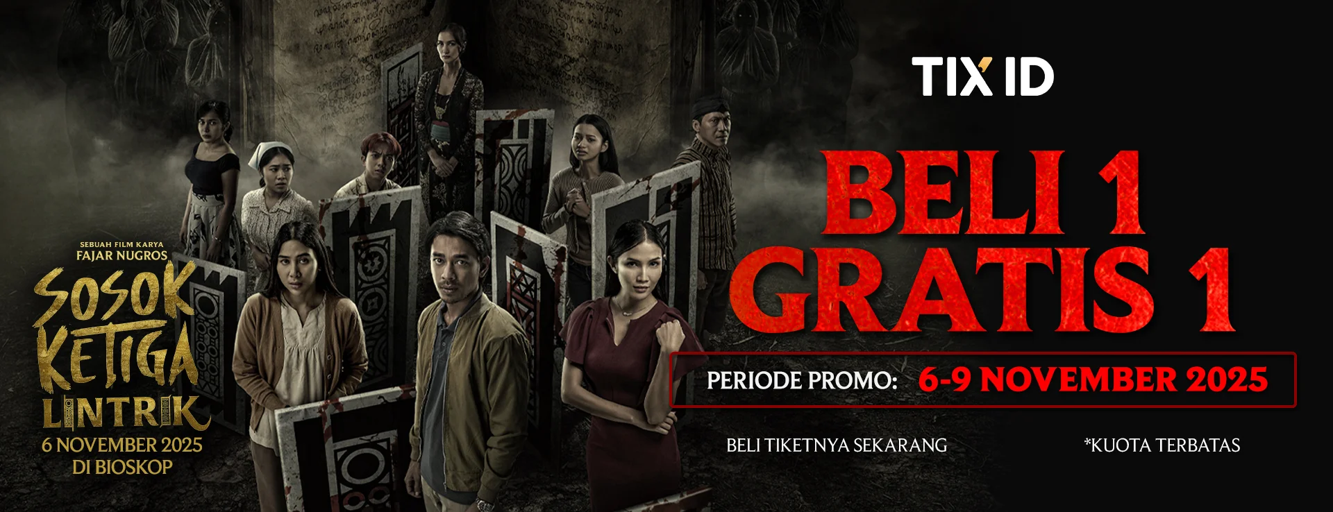 Dapatkan promo Buy 1 Get 1 Free film SOSOK KETIGA: LINTRIK mulai tanggal 06 - 09 November 2025. Pesan tiketnya sekarang dengan klik tombol “Beli Tiket” di bawah ini!