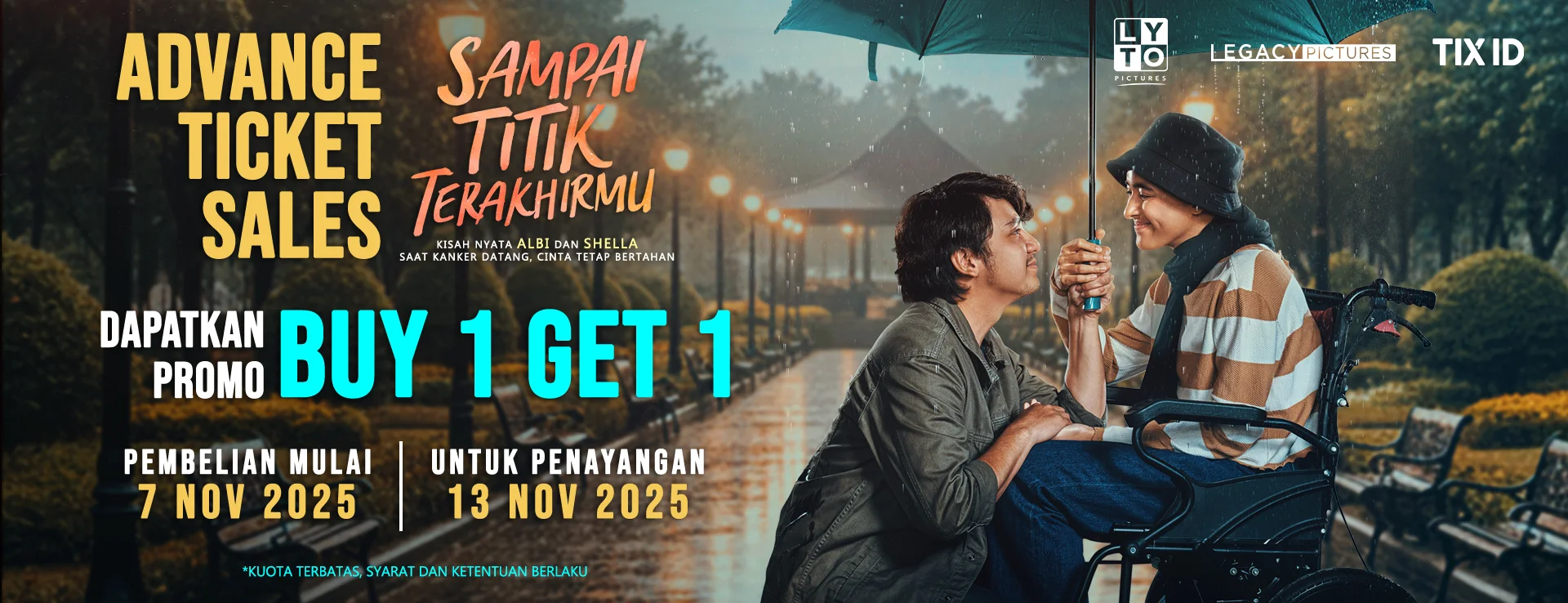 Dapatkan promo Buy 1 Get 1 Free film SAMPAI TITIK TERAKHIRMU mulai tanggal 07 November 2025, untuk penayangan perdana tanggal 13 November 2025. Pesan tiketnya sekarang dengan klik tombol “Beli Tiket” di bawah ini!