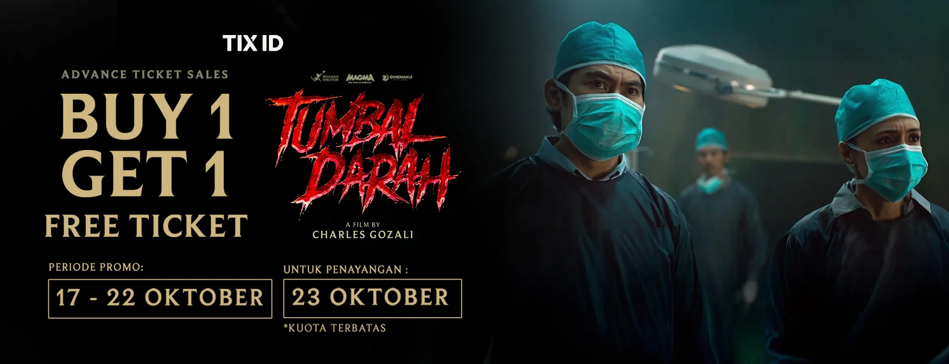 Dapatkan promo Buy 1 Get 1 Free film Tumbal Darah mulai tanggal 17 Oktober 2025, untuk penayangan perdana tanggal 23 Oktober 2025. Pesan tiketnya sekarang dengan klik tombol “Beli Tiket” di bawah ini!