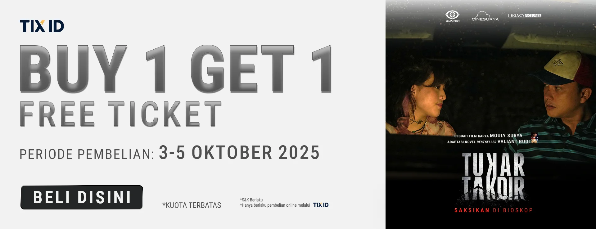 Dapatkan promo Buy 1 Get 1 Free film Tukar Takdir mulai tanggal 03 - 05 Oktober 2025. Pesan tiketnya sekarang dengan klik tombol “Beli Tiket” di bawah ini!