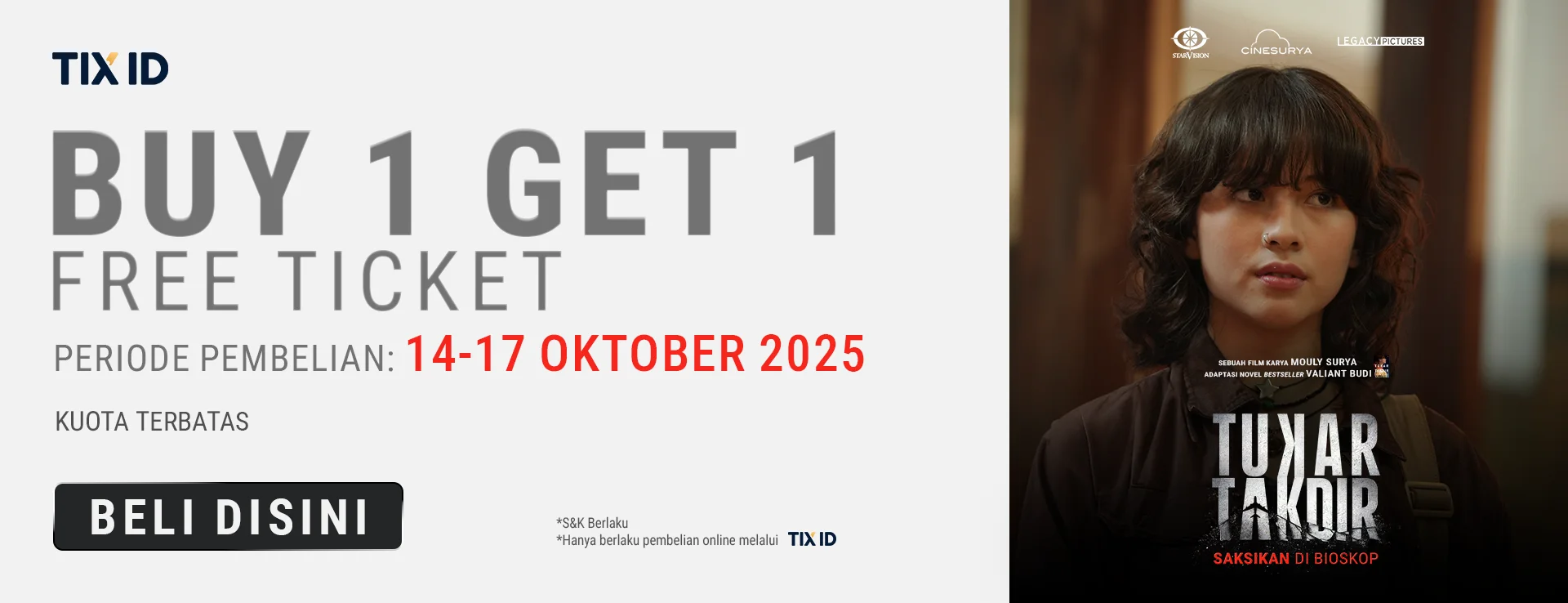 Dapatkan promo Buy 1 Get 1 Free film Tukar Takdir mulai tanggal 14 - 17 Oktober 2025. Pesan tiketnya sekarang dengan klik tombol “Beli Tiket” di bawah ini!