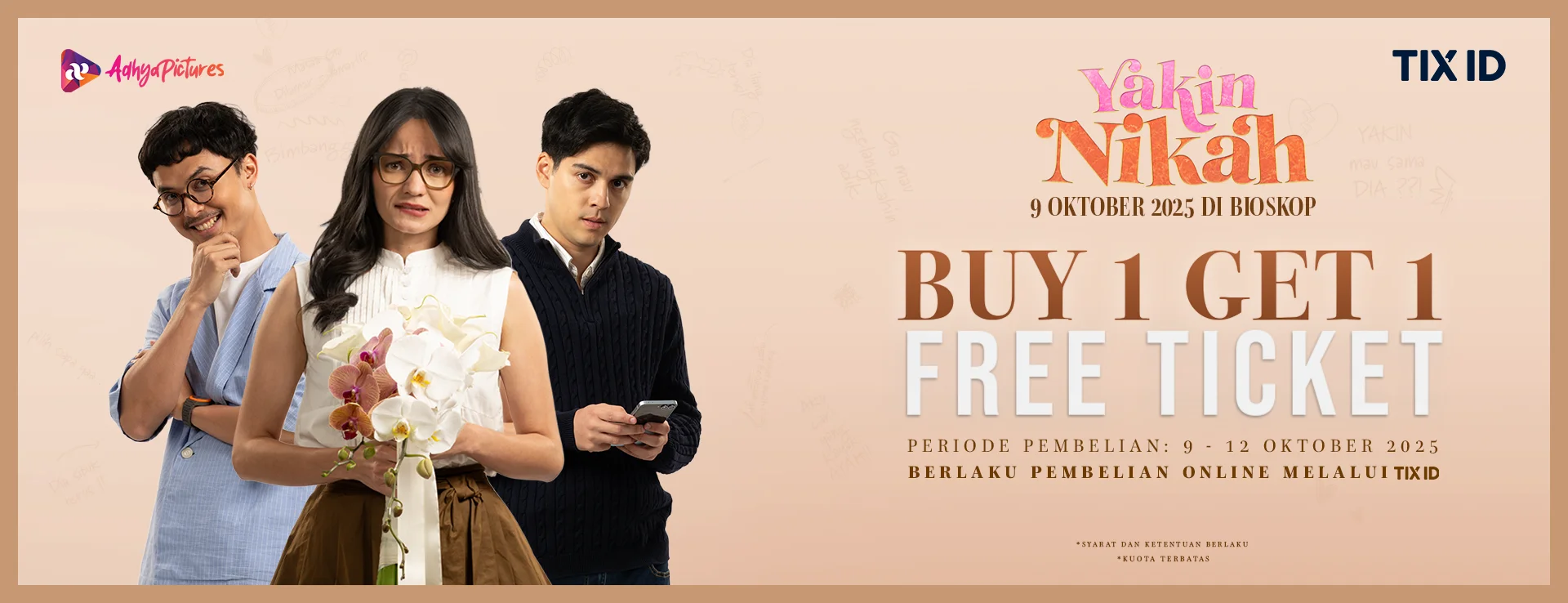 Dapatkan promo Buy 1 Get 1 Free film YAKIN NIKAH mulai tanggal 09 - 12 Oktober 2025. Pesan tiketnya sekarang dengan klik tombol “Beli Tiket” di bawah ini!