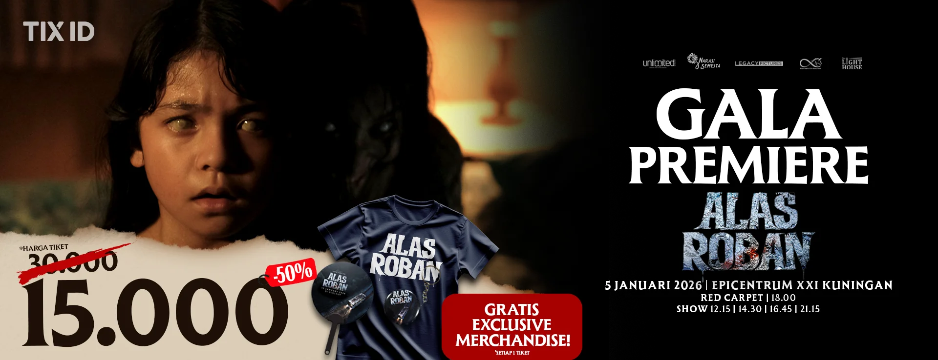 Dapatkan promo Diskon 50% untuk 1 Tiket dan dapatkan exclusive merchandise film ALAS ROBAN mulai pembelian tanggal 31 Desember 2025, khusus untuk Gala Premiere tanggal 05 Januari 2026 hanya di EPICENTRUM XXI. Pesan tiketnya sekarang dengan klik tombol “Beli Tiket” di bawah ini!
