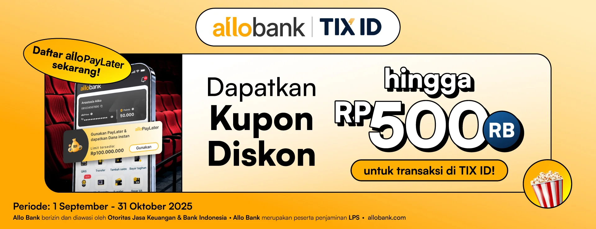 Apply Allo PayLater hingga disetujui dan dapatkan kupon diskon hingga Rp 500.000 untuk transaksi di aplikasi TIX ID menggunakan QRIS.